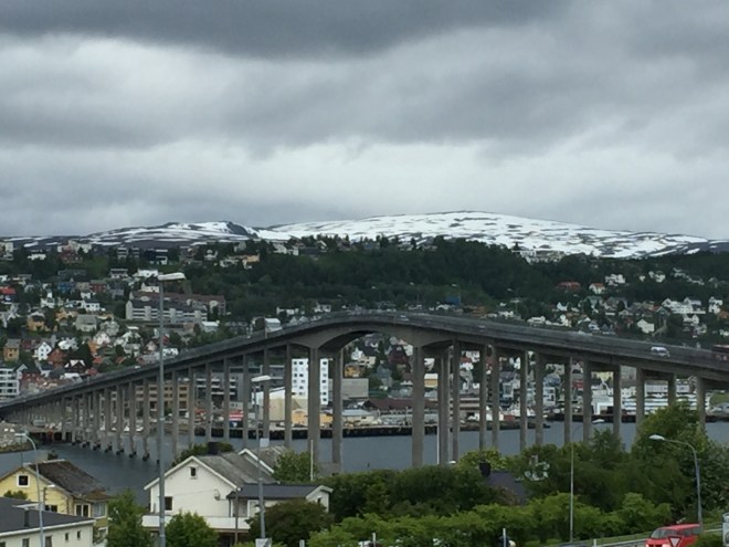 Questa è la vista che di gode attraversando il Bruvegen Bridge , il ponte che collega le due parti di Tromsø sul mare di Norvegia . Tromsø , è una cittadina moderna , piccola , ma molto bella , costruita sul mare con tutto quello che serve ad una città del futuro : opportunità . Buona giornata e Buon Viaggio